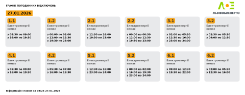 Сьогодні, 27 січня, на території Львівської області енергетики застосовуватимуть графіки погодинних відключень електроенергії.