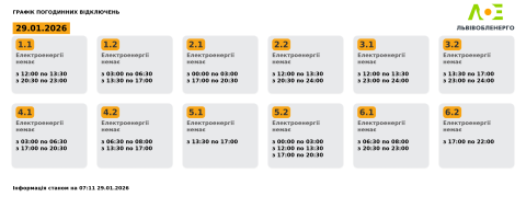 Сьогодні, 29 січня, на території Львівської області енергетики застосовуватимуть графіки погодинних відключень електроенергії.