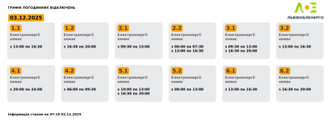 Сьогодні, 3 грудня, на території Львівської області енергетики застосовуватимуть графіки погодинних відключень електроенергії.