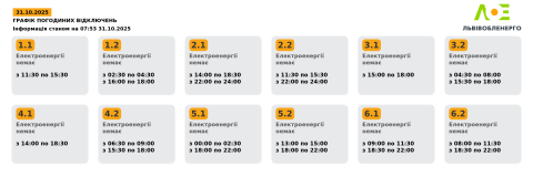 Нагадаємо, з 30 жовтня внаслідок масованої ракетно-дронової атаки на енергетичну інфраструктуру на території Львівської області запровадили графіки погодинних відключень електроенергії.