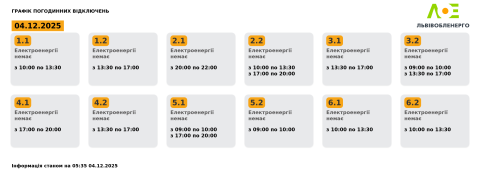Сьогодні, 4 грудня, на території Львівської області енергетики застосовуватимуть графіки погодинних відключень електроенергії.