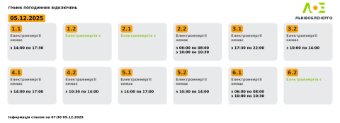Сьогодні, 5 грудня, на території Львівської області енергетики застосовуватимуть графіки погодинних відключень електроенергії.