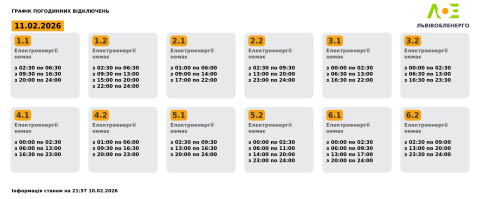 Сьогодні, 11 лютого, на території Львівської області енергетики застосовуватимуть графіки погодинних відключень електроенергії.