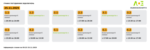 Сьогодні, 25 листопада, на території Львівської області енергетики застосовуватимуть графіки погодинних відключень електроенергії.