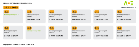Сьогодні, 26 листопада, на території Львівської області енергетики застосовуватимуть графіки погодинних відключень електроенергії.
