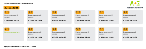 Сьогодні, 27 листопада на території Львівської області енергетики застосовуватимуть графіки погодинних відключень електроенергії.