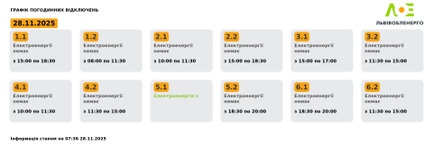 Сьогодні, 28 листопада, на території Львівської області енергетики застосовуватимуть графіки погодинних відключень електроенергії.