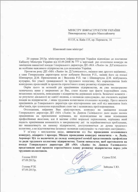 Окрім того, працівники звернулися до міністра інфраструктури з вимогою не допускати до конкурсу та не призначати на посаду генерального директора аеропорту Львів осіб із числа, яким оголошено недовіру.