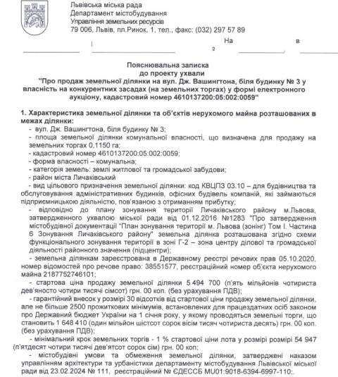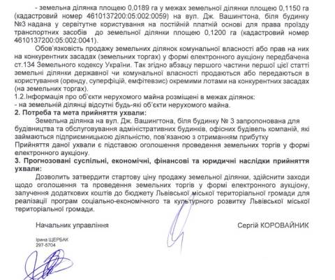 Ділянку на вул. Дж. Вашингтона продають за 5 494 700 грн. Як пояснили у міськраді, продаж цієї земельної ділянки дозволить залучити додаткові кошти до міського бюджету та забезпечить ефективне використання земельного фонду.