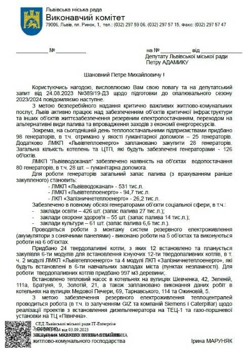 Про це йдеться у відповіді Львівської міської ради на запит депутата міськради Львова, керівника фракції Європейська Солідарність Петра Адамика.