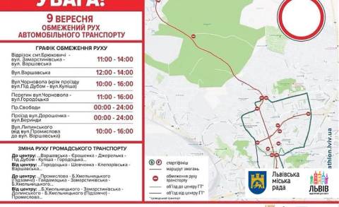 Починаючи з 10.00 год, поетапно перекриватимуть для руху транспорту вул. Замарстинівську, вул. Варшавську, пр. Чорновола, частину вул. Липинського. Тролейбус № 13 не курсуватиме до 17.00 год, а у русі трамваїв № 1, 2, 6, 7, 9 можливі затримки в центрі міста.