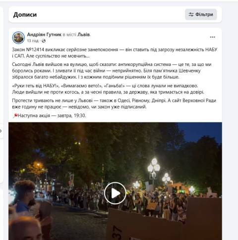 Львів вийшов на вулицю, щоб сказати: антикорупційна система – це те, за що ми боролись роками. І зливати її під час війни – неприйнятно. Наступна акція – завтра, 19:30" – написав Гутник.