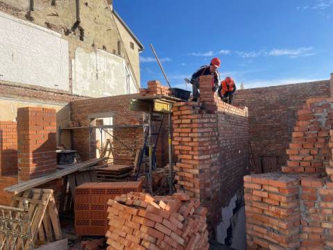 У місті відбудовують будинок на вул. Коновальця, 44, що був зруйнований під час ракетного удару 4 вересня 2024 року. Тут вже демонтували аварійні конструкції та зводять нові стіни.