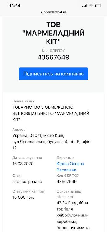 ТОВ "Мармеладний кіт" зареєстроване в Україні у Києві вул. Ярославська, 4Б, офіс 12 (код ЄДРПОУ – 43567649).