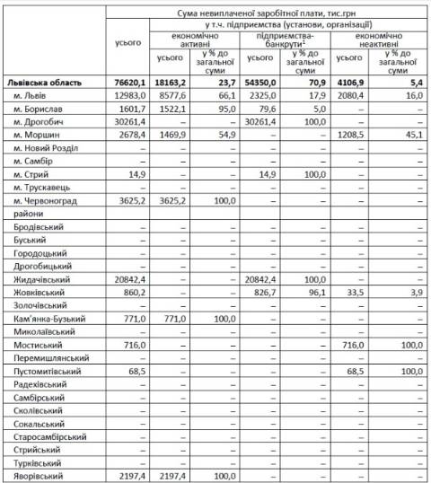 На початок травня 2018 року більше половини заборгованості економічно активних підприємств припало на охорону здоров’я та надання соціальної допомоги (35,7%) і будівництво (28,2%), а основну частину боргу було утворено в містах Львів (47,2%), Червоноград (20%) та Яворівському районі (12,1%).