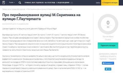 9 грудня, на порталі е-петицій студент юридичного факультету Львівського національного університету ім. Івана Франка Дмитро Ворончак зареєструвув петицію з вимогою перейменувати вулицю Миколи Скрипника на вулицю Герша Лаутерпахта.