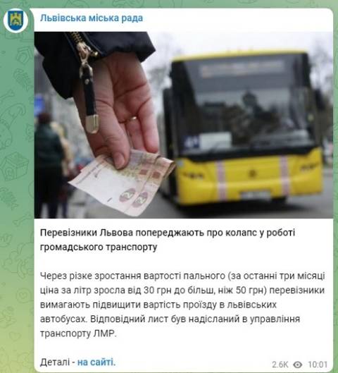 Як наголошують перевізники, основною причиною перегляну тарифу на проїзд є різке зростання вартості пального (за останні три місяці ціна за літр зросла від 30 грн до більш ніж 50 грн).