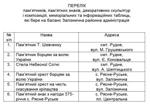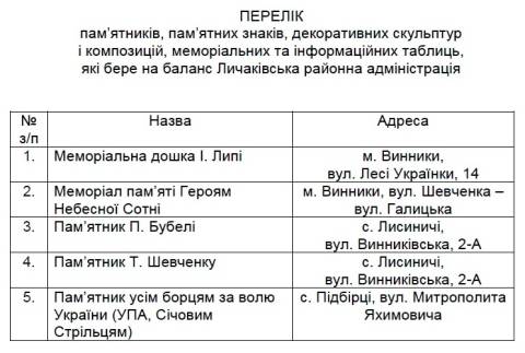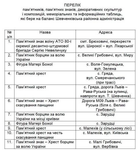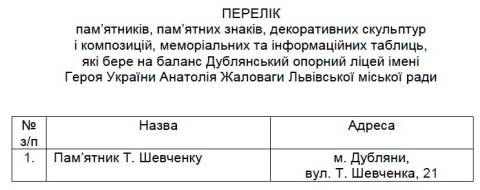 "Взяти на баланс пам’ятники, пам’ятні знаки, декоративні скульптури і композиції, меморіальні та інформаційні таблиці Залізничній РА, Личаківській РА, Шевченківській РА, Дублянському опорному ліцею імені Героя України Анатолія Жаловаги Львівської міської ради до 31.05.2023" – йдеться у тексті рішенні.