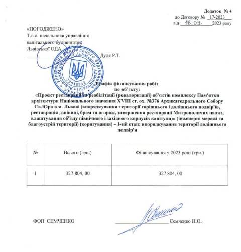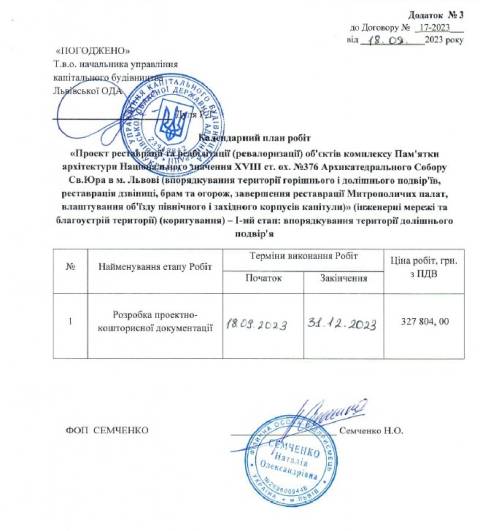 Згідно з закупівлею, Наталія Семченко повинна провести коригування проєктно-кошторисної документації – "Проєкт реставрації та реабілітації (ревалоризації) об'єктів комплексу Пам'ятки архітектури Національного значення XVIII ст. ох. №376 Архикатедрального Собору Св.Юра в м. Львові (впорядкування території горішнього і долішнього подвір'їв, реставрація дзвіниці, брам та огорож, завершення реставрації Митрополичих палат, влаштування об'їзду північного і західного корпусів капітули)".