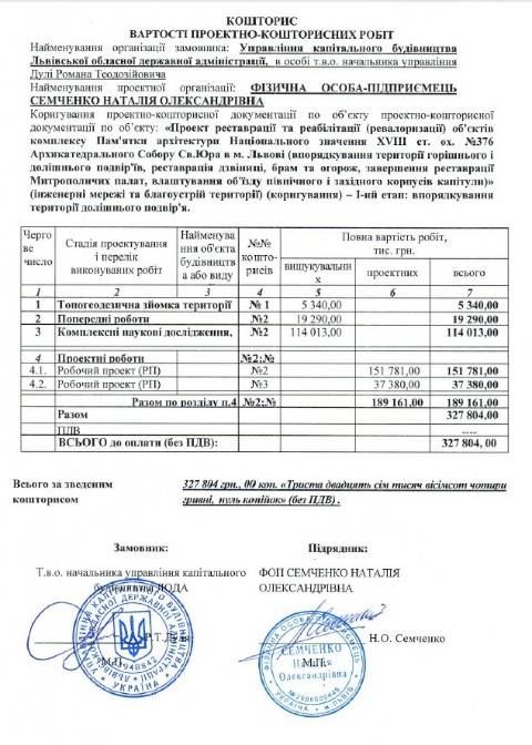 Львівська ОВА замовила за 327 тисяч гривень коригування ПКД з реставрації Собору Святого Юра у Львові у підприємниці зі Львова.