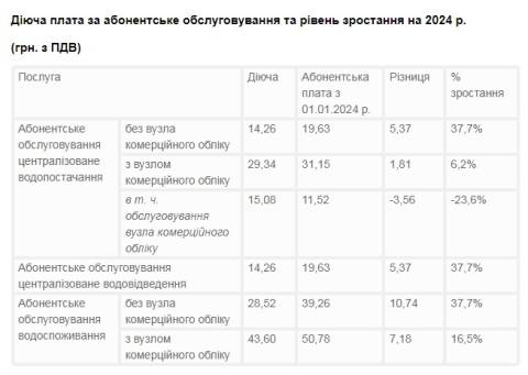Плата за централізоване водовідведення зросте на 37,7%, а за абонентське обслуговування водоспоживання – на 37,7% без вузла комерційного обліку та на 16,5% з вузлом комерційного обліку.
