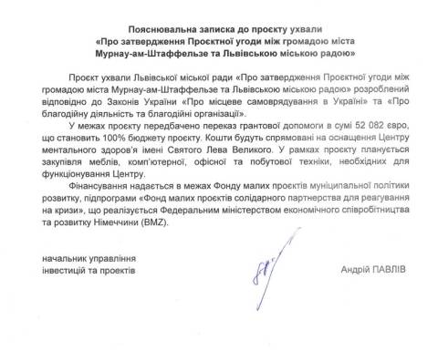 Львівська міськрада оприлюднила проєкт ухвали про затвердження проєктної угоди між громадою німецького міста Мурнау-ам-Штаффельзе та Львовом щодо фінансування проєкту в межах системи "Незламні".