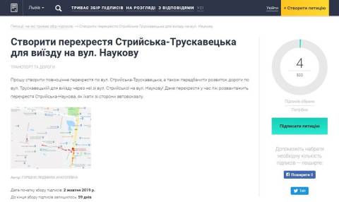 "Прошу створити повноцінне перехрестя по вул. Стрийська-Трускавецька, а також передбачити розвиток дороги по вул. Трускавецькій для виїзду через неї зі вул. Стрийської на вул. Наукову. Дане перехрестя у час пік розвантажить перехрестя Стрийська-Наукова, як їхати зі сторони автовокзалу" – йдеться у тексті петиції.