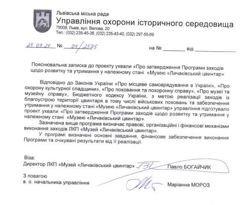 "З метою реалізації заходів із благоустрою території цвинтаря, у тому числі військових поховань, та забезпечення утримання у належному стані ЛКП "Музей "Личаківський цвинтар" міська рада ухвалила затвердити Програму заходів щодо розвитку та утримання у належному стані ЛКП "Музей "Личаківський цвинтар" – йдеться у тексті ухвали.