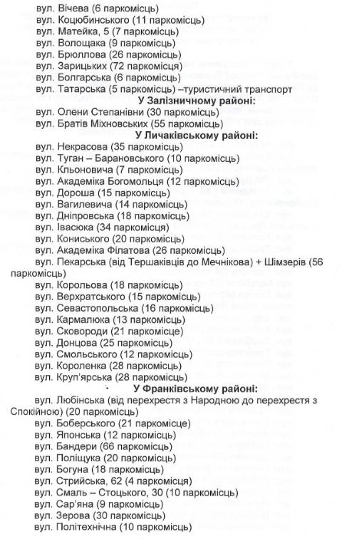 Зокрема, у Галицькому районі міста облаштують 37 нових майданчиків для паркування авто та одне місце для туристичного транспорту, у Залізничному районі – 3 місця для паркування, у Личаківському – 20 місць, у Франківському районі – 26 місць, у Шевченківському районі – 16 місць.