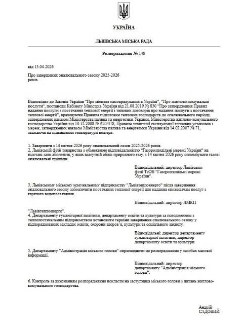"Завершити з 14 квітня 2026 року опалювальний сезон 2025-2026 років. Львівській філії ТзОВ "Газорозподільні мережі України" на підставі заяв абонентів, у яких відсутній облік природного газу, з 14 квітня 2026 року опломбувати газові опалювальні прилади" – йдеться у розпорядженні.