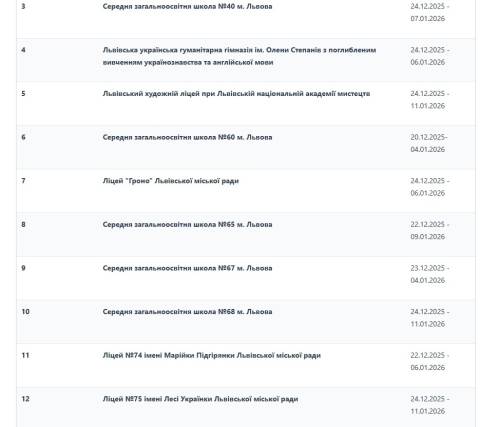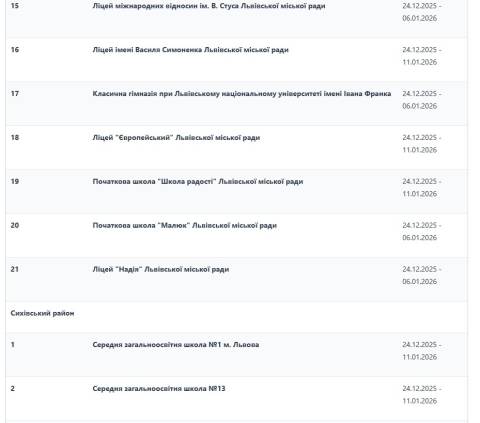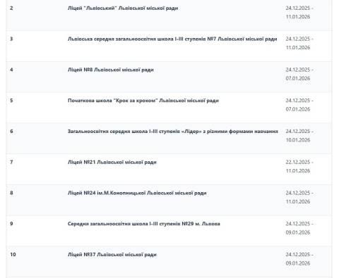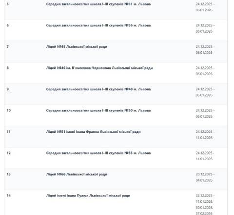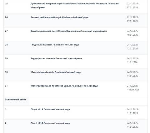 У більшості львівських шкіл канікули розпочнуться в останній тиждень грудня.