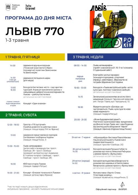 О 12:00-18:00 год – заходи для всієї сім'ї "Простір 770 зустрічей". На площі перед Львівським національним університетом імені Івана Франка для дітей і дорослих підготують насичену програму: майстер-класи, зокрема з архітектурного напряму, аквагрим, а також виступи творчих колективів. Перед гостями, зокрема, виступлять ансамбль пісні і танцю "Черемош" університету Франка та духовий оркестр "Львівські фанфари".