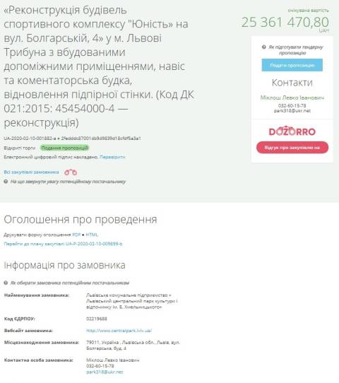 Львівське комунальне підприємство "Львівський центральний парк культури і відпочинку ім. Б. Хмельницького" оголосив тендер у системі ProZorro на реконструкцію будівель спортивного комплексу "Юність" на вул. Болгарській, 4 у Львові, які переможець тендеру має поставляти до 31 грудня 2021 року.