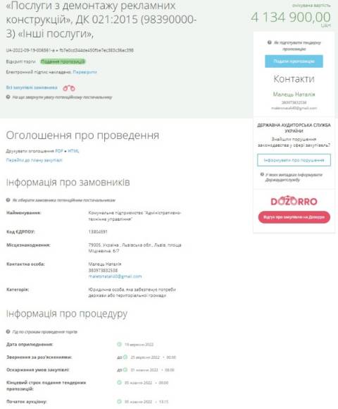 КП "Адміністративно-технічне управління" замовило за 4,1 мільйона гривень демонтаж рекламних вивісок у Львові.