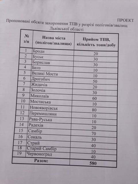 Відтак згідно з документом, 19 міських рад Львівщини прийматимуть наступні два роки щодня 580 тонн сміття. Найбільшу кількість звозитимуть у Новояворівськ (80 тонн на добу),Самбір (70 тонн на добу), Миколаїв (60 тонн на добу) та Дрогобич (50 тонн на добу).