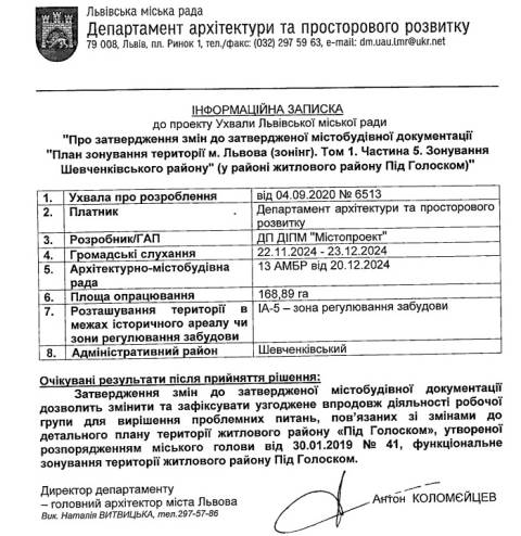 – затвердження змін до затвердженої містобудівної документації "План зонування території м. Львова (зонінг). Том 1. Частина 5. Зонування Шевченківського району" (зміни до забудови житлового району Під Голоском на замовлення департаменту архітектури Львівської міськради);