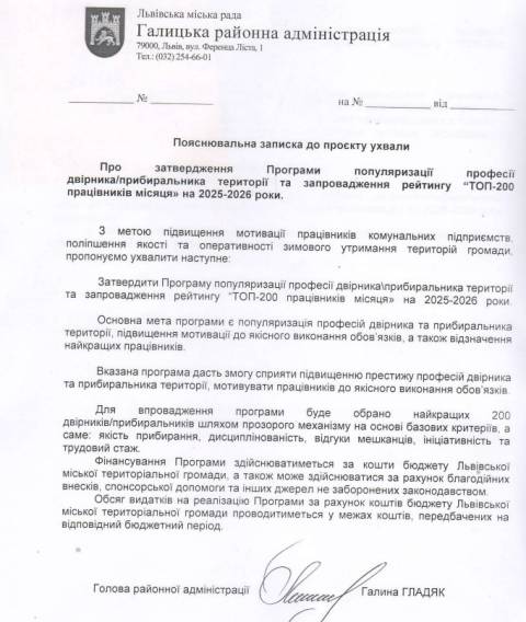 На сайті Львівської міськради підготували та оприлюднили проєкт ухвали, якою пропонують затвердити Програму популяризації професії двірника/прибиральника території та запровадити рейтинг "ТОП-200 працівників місяця" на 2025-2026 роки.