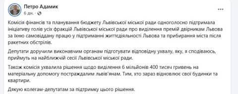 Зазначимо, нещодавно комісія фінансів та планування бюджету Львівської міськради підтримала ініціативу голів усіх фракцій про виділення премій двірникам Львова за їхню самовіддану працю та прибирання міста після ракетних обстрілів.