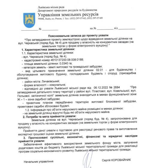 На сайті Львівської міськради оприлюднили проєкт ухвали, якою пропонують затвердити проєкт землеустрою щодо відведення земельної ділянки на вул. Черкаській, 4 для продажу на земельних торгах у формі електронного аукціону.