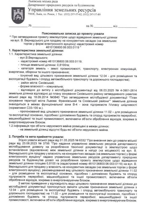 "Затвердити проєкт землеустрою щодо відведення земельної ділянки для продажу у власність на конкурентних засадах площею 0,81 га на вул. В. Вернадського, рекомендований вид цільового призначення земельної ділянки – для розміщення та експлуатації основних, підсобних і допоміжних будівель та споруд підприємств переробної, машинобудівної та іншої промисловості, включаючи об’єкти оброблення відходів, зокрема із енергогенеруючим блоком, за рахунок земель промисловості, транспорту, електронних комунікацій, енергетики, оборони та іншого призначення, перевівши їх із земель, що не надані у власність або користування" – йдеться в ухвалі.