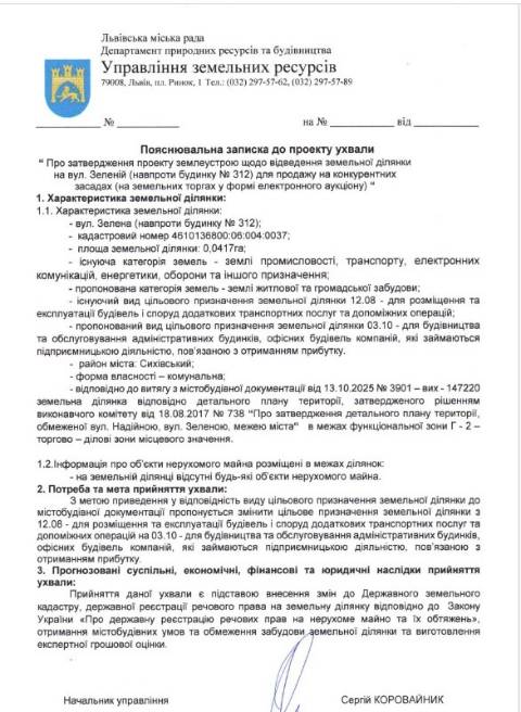 Згідно з документом, йдеться про ділянку площею 0,0417 га, що знаходиться на вул. Зеленій (навпроти будинку № 312) у Сихівському районі Львова й перебуває у комунальній власності Львова. На цій ділянці відсутні будь-які об’єкти нерухомості.