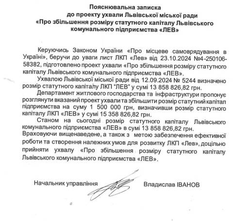 У пояснювальній записці до проєкту ухвали вказано, що поповнення статутного капіталу цього підприємства з бюджету Львова зумовлене намаганням забезпечити ефективну роботу та створенням належних умов для розвитку ЛКП "Лев".