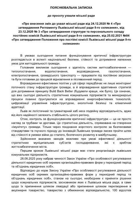 Як вказано у пояснювальній записці до проєкту ухвали, контроль за функціонуванням критичної інфраструктури – це не просто нагляд за трубами чи дротами, а стратегічна діяльність, спрямована на створення "імунітету" громади. Тому першим кроком Львівської міськради має стати реорганізація львівських комунальних підприємств.