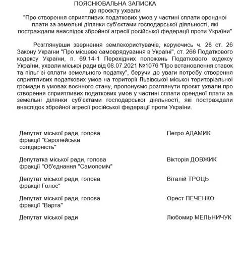 На сайті Львівської міськради підготували та оприлюднили проєкт ухвали, якою планують створити сприятливі податкові умови щодо сплати орендної плати за земельні ділянки суб’єктами господарської діяльності, які постраждали внаслідок збройної агресії РФ проти України.
