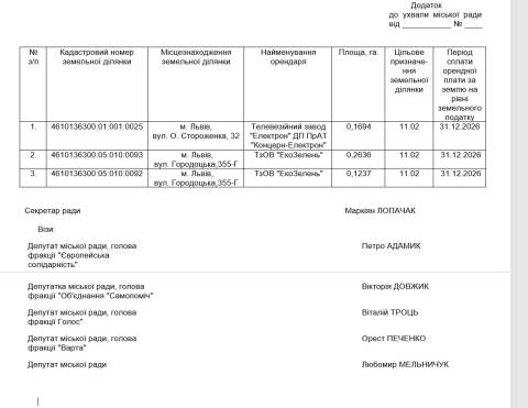 Згідно з документом, йдеться про два львівські підприємства – телевізійний завод "Електрон" ДП ПрАТ "Концерн-Електрон" та ТзОВ "ЕкоЗелень", яким до 31 грудня 2026 року планують встановити орендну плату за землю на рівні земельного податку.