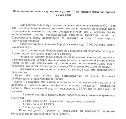 "Надати місцеву гарантію Львівської міської ради для забезпечення повного виконання боргових зобов’язань ЛМКП "Львівводоканал", за кредитом, що залучається у ЄБРР для реалізації інвестиційного проєкту "Будівництво нових піскоуловлювачів на ОС 1-2 та ОС 3-4 із запровадженням автоматичного контролю переливу стічних вод", метою якого є підвищення ефективності системи очищення стічних вод у Львівській МТГ" – вказано у проєкті ухвали.