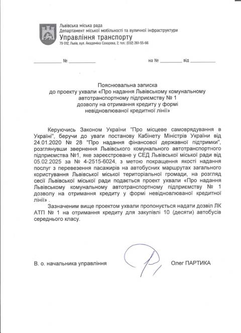 Згідно з документом, АТП № 1 планує взяти кредит для того, щоб покращити якість надання послуг з перевезення пасажирів на автобусних маршрутах загального користування Львівської МТГ.
