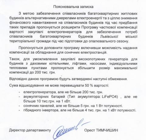 Згідно з документом, програму планують розширити для забезпечення ОСББ альтернативними джерелами електроенергії та зниження фінансового навантаження на співвласників будинків під час придбання таких приладів під час підготовки до опалювального сезону.
