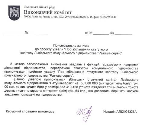 "Збільшити статутний капітал ЛКП "Ратуша-сервіс" на 50 000 000 грн та визначити його розмір у сумі 353 310 458 грн 54 коп." – йдеться в проєкті ухвали.