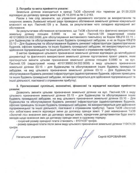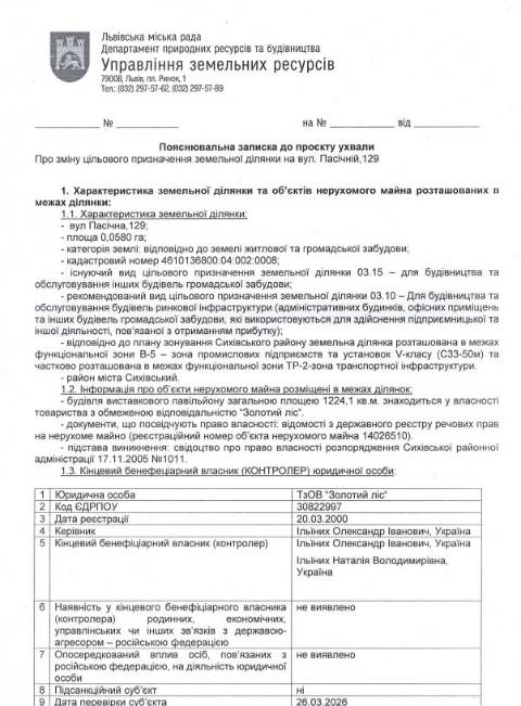 Згідно з документом, йдеться про земельну ділянку площею 0,0580 га на вул. Пасічній, 129 у Сихівському районі Львова, що перебуває у комунальній власності Львова. На цій ділянці знаходиться будівля виставкового павільйону площею 1224,1 м², що з 2005 року є у приватній власності ТзОВ "Золотий ліс". Фірма орендує у міськради цю земельну ділянку з 2016 року й термін оренди завершується у вересні цього року.
